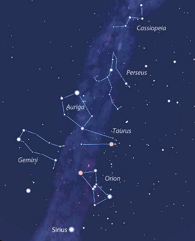See Winter Night Sky for tracing out part of the Northern Milky Way by some constellations. The Milky Way is visible by naked-eyes only in country side away from city light as its mv ~ +5 is near the visual limit. BTW, the original "Sky Chart" in Figure 08-01z51 has something to do with the "Pyramids at Giza" - (Milky Way = Nile River). |