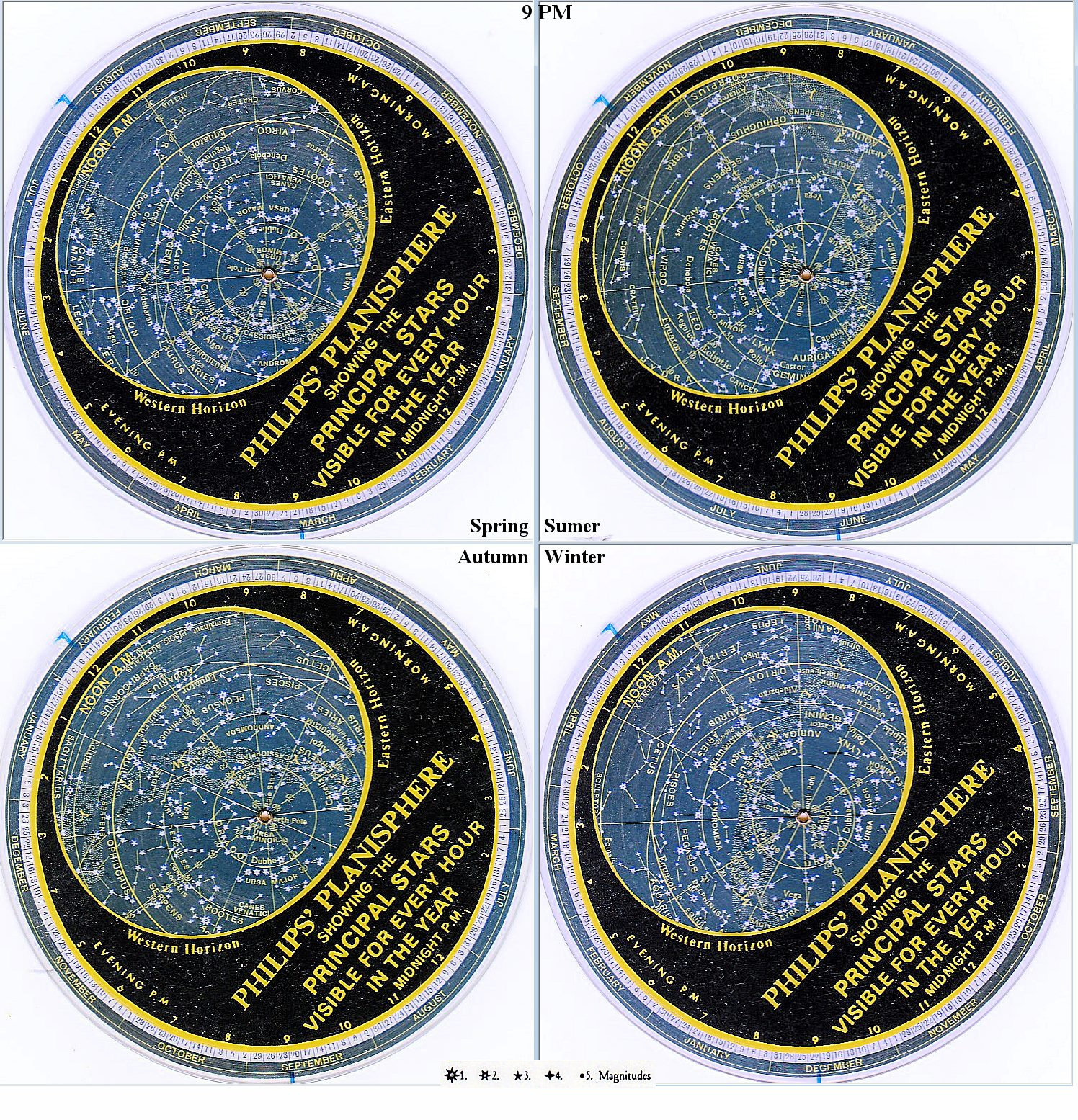 Figure 08-01p shows the signposts of 4 different seasons on a particular day, time, location, and direction as indicated in the images. However, the pattern should be approximately valid during the viewing season when adjustments are taken on the shift in day and difference in location. The connecting lines between the brighter stars trace out some kind of object. They are purely artificial pictures making up by observers. The distribution of stars is really random, it requires a lot of imagination to figure out something out of them. |